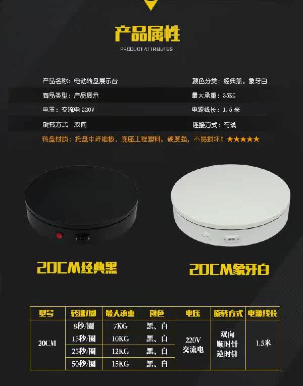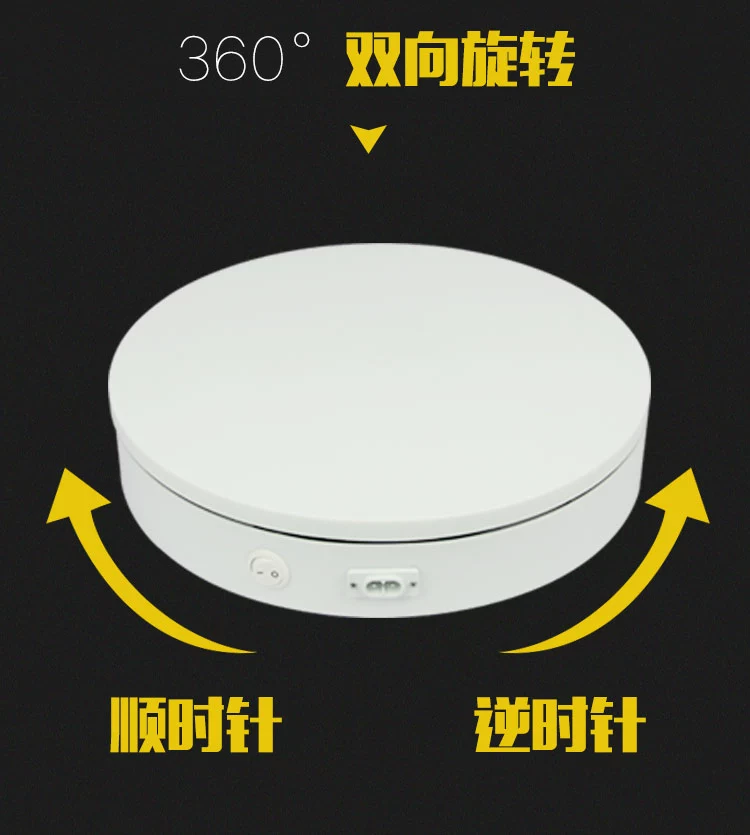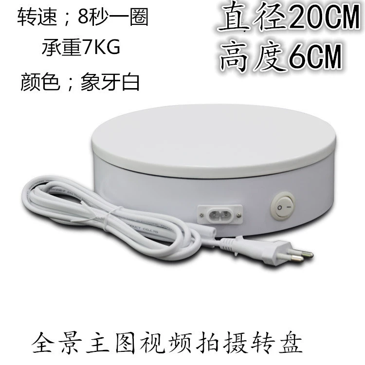 Note: Most of our products are shipped quickly. Some items are not in stock and are made to order, which requires factory scheduling and may cause a shipping delay. However, for the vast majority of products, the delivery time is much shorter than expected, and most of customers who place orders will usually receive their goods ahead of the scheduled timeframe.1.Power supply: AC current220V2.size: bottom diameter * height:20CM*6CM 3.Load bearing:25A second around15KG;8A second around8kg4.Speed: about25One lap per second 、8One revolution per second; one speed per machine 5.Features: The clockwise switch is always one-way; the bidirectional switch is random when it is turned on;360Degree full-position display; electric and manual rotation do not interfere with each other (electric and manual rotation can be carried out at the same time), large load bearing; smooth and uniform rotation; suitable for taking photos and making3DFig.6.Color: black, white7.Rotation mode: clockwise, counterclockwise (controlled randomly when the switch is turned on)8.Scope of application: Suitable for camera use of shoes and bags, can be used as table turntable, model turntable, and product display cabinet chassis, etc.9.Turntable material:MDFmedium density fiberboard10.Power cord length:1.8meters11.Gross weight of packaging:1KG .........'