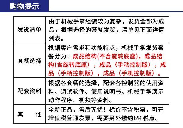 Note: Most of our products are shipped quickly. Some items are not in stock and are made to order, which requires factory scheduling and may cause a shipping delay. However, for the vast majority of products, the delivery time is much shorter than expected, and most of customers who place orders will usually receive their goods ahead of the scheduled timeframe.' Bionic mechanical palm/6Freedom robot arm/robot five-finger robot/maker education kit